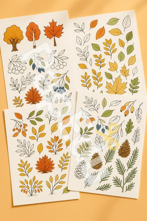 Na kartach znajdziesz liście klonu, dębu, brzozy, topoli i kasztanowca, a także jesienne krzewy, gałązki z owocami, żołędzie, szyszki i trawy.