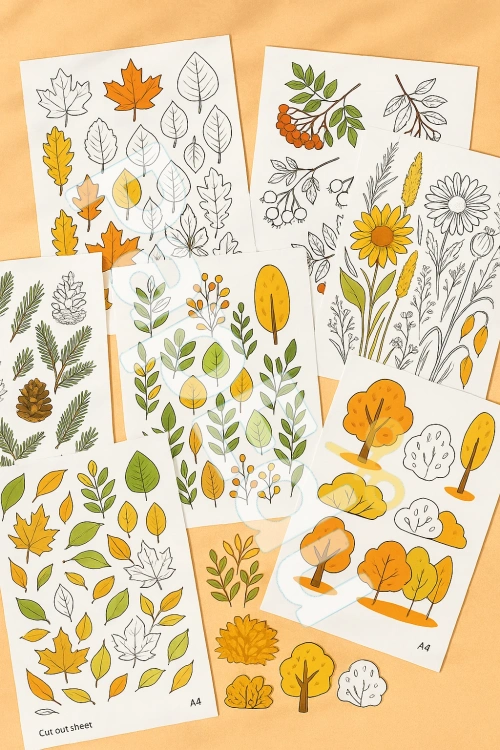 Na kartach znajdziesz liście klonu, dębu, brzozy, topoli i kasztanowca, a także jesienne krzewy, gałązki z owocami, żołędzie, szyszki i trawy.