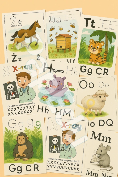 „Poznajemy litery z wesołymi zwierzątkami” to pełny zestaw kart pracy dla przedszkolaków, obejmujący wszystkie litery polskiego alfabetu (A–Z oraz Ą, Ć, Ę, Ł, Ń, Ó, Ś, Ź, Ż).